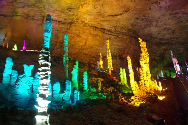 黃龍洞位于索溪峪東面,被稱為“地下魔宮”,洞口霧靄迷漫,洞內長廊蜿蜒,鐘乳懸浮,石柱石筍林立,還有石簾、石幔、石花、石琴,琳瑯滿目,異彩紛呈,令人目不暇接!岸赐舛础薄ⅰ皹峭鈽恰、“天外天”、“山外山”,盤根錯節(jié)。黃龍洞內可分四層,水陸并進,從最低陰河至最高穹頂,垂直高度差有100多米,洞內有一個水庫(黃龍水洞)、二條陰河(響水河、水晶河)、三個地下瀑布(黃龍瀑、天水瀑、天地瀑)、四個水潭、十三個廳(宮)(龍舞宮、水晶宮、迷人宮……)、九十六條游廊,長度約達15公里,最大的廳堂有12000平方米,可容納萬人。真可謂是洞中乾坤大,地下有洞天。入黃龍洞,如入人間仙境一般。