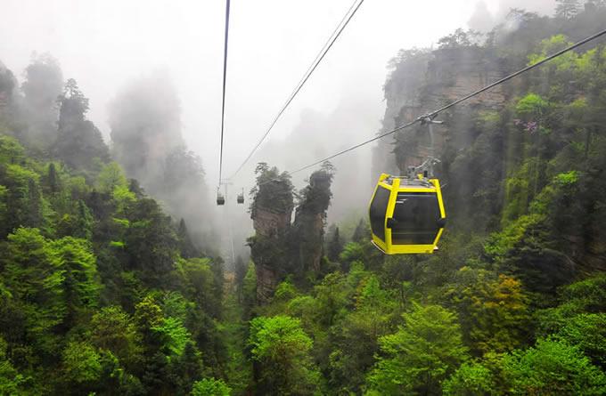 楊家界風光 楊家界索道是世界自然遺產(chǎn)武陵源風景名勝區(qū)繼天子山索道、黃石寨索道后的第三條客運索道,上站位于八里坡游覽線劉家檐,下站位于中湖鄉(xiāng)野溪鋪村。該索道采用法國,斔鞯涝O(shè)備,是世界頂級雙回路循環(huán)式配置八人車廂式索道,全長1876米,上下站垂直高差517米,線路支架14個,最高運行速度6m/s,最大運力為2300人/小時,單程運行時間5.2分鐘,是目前國際最先進的客運索道。