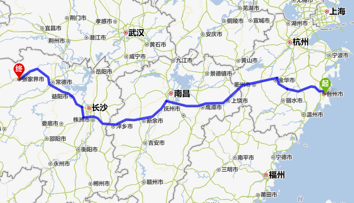 左右,沿途經過臺州——金華市——衢州市——上饒市——鷹潭市——新余市——宜春市——萍鄉(xiāng)市——株洲市——湘潭市——寧鄉(xiāng)縣——益陽市——常德市——慈利縣——張家界。