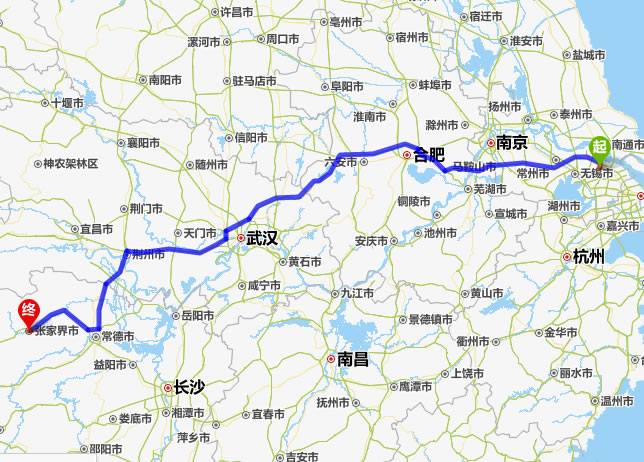 左右,沿途經過常熟——馬鞍山市——合肥——六安市——麻城市——仙桃市——潛江市——荊州市——常德市(這里可以不走常德,直接從荊州經澧縣、石門縣到慈利縣)——慈利縣——張家界。