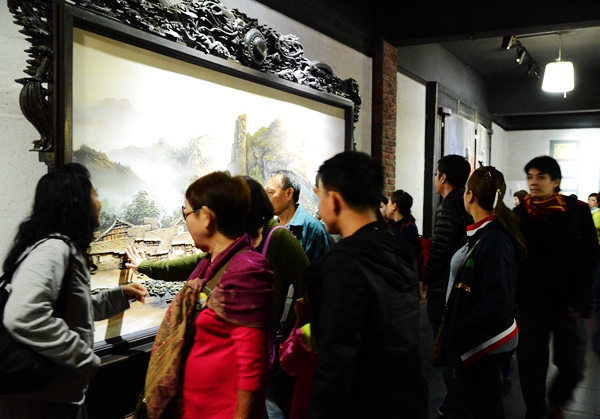 一批馬來(lái)西亞客人在參觀砂石畫(huà)